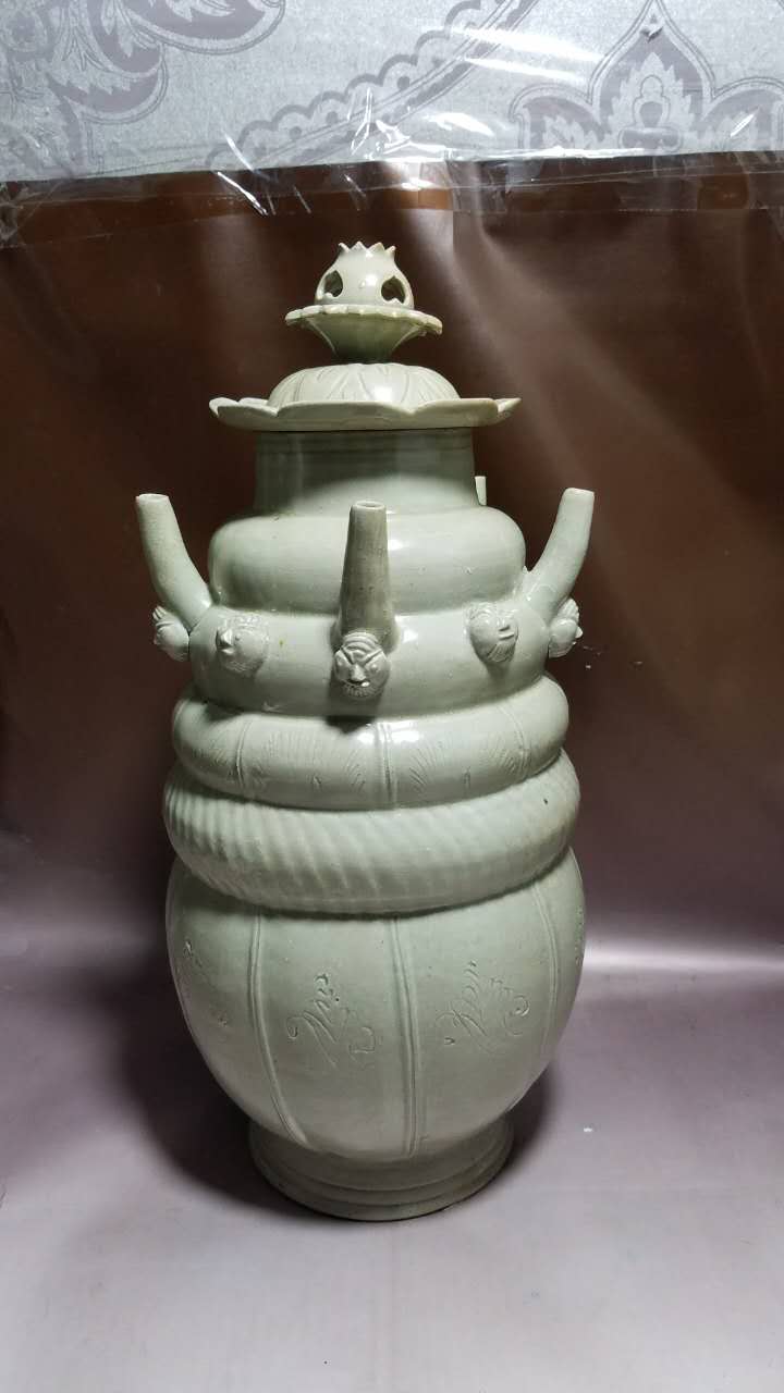 金村窑青釉贴塑脸谱划花刻莲纹榴花盖五管瓶(北宋)